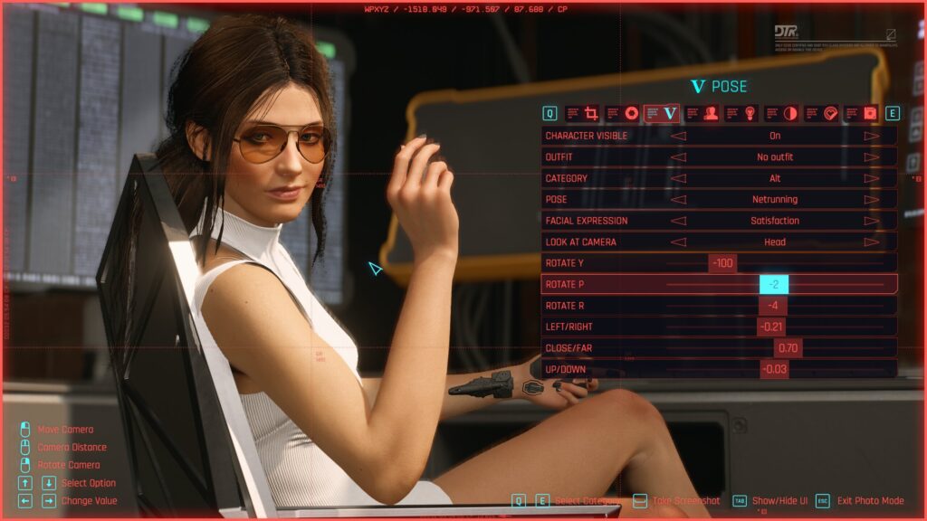 Action shots are surprisingly difficult to take in-game. Unlike 3rd person action games, CP2077 does not render Vโs animation in photo mode. So I couldnโt capture Vโs motion while slashing with a katana, or reloading a shotgun. The photo mode allows for action-oriented poses to compensate for this shortcoming. But itโs not the same. Itโs a bit disappointing, considering all the possibilities with all the slick-looking melee weapons. I’ll have to make do with what other options are available.