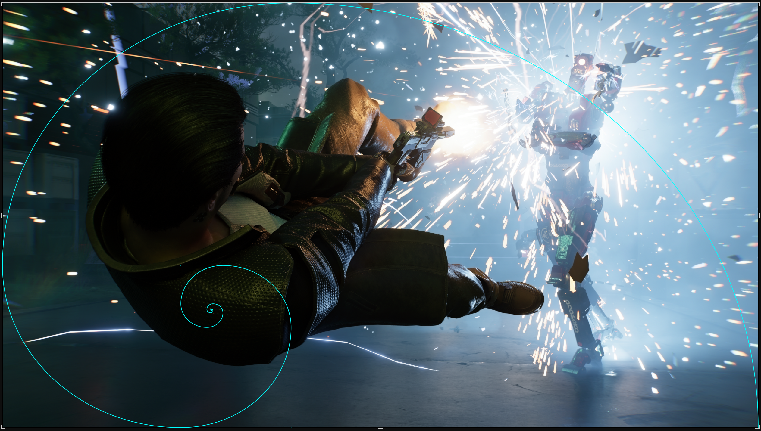This photo does follow the golden spiral, as well as the rule of thirds (albeit weakly). I also sacrificed depth of field to keep the short circuited robotโs image sharp and clear. What the photo does have strongly, however, is a radial composition, with the sparks, bolts and V himself flying away from the robot. The photo mode’s chromatic aberration slider subtly stretched out the edges of the image, accentuating the sparks’ perceived motion. Reciprocally, the direction V is looking at and how the pistol is aimed creates a leading line, the presumed path of a bullet, back to the robot. Itโs too bad there was no good way to show Vโs face here, which I had set an aggressive expression to evoke tension or desperation as he tries to avoid getting hurt or killed.