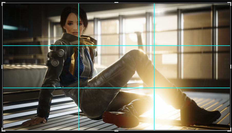Two things are most obvious here to me. One, I really like the warm lighting here. Second, this shot obviously follows the rule of thirds. But more importantly, it also follows the golden spiral whose path hits Silverhandโs face, the bottles of liquor, the bar and the lady. The depth of field not only creates a better sense of space and distance, but also creates a play of perspective and emphasis. This shot just as easily couldโve focused on the lady instead and have Silverhand as part of a blurred foreground rather than the main subject. This is an exercise I used to practice back when I was still learning to be more deliberate with my composition.