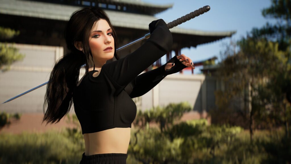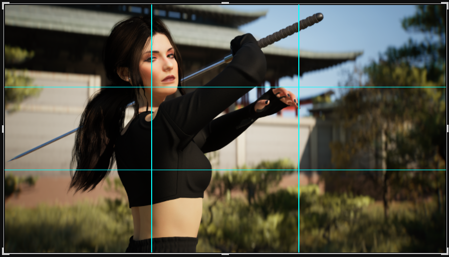 This retake lines up V’s dominant eye, and along with it were her head and upper body to follow the rule of thirds. There are a lot of overlapping objects in the frame. Fortunately, the combination of the relatively thin depth of field and the building in the background allowed for a clearer separation from the subject. The building also contextualizes the picture. This version of my V is definitely Caucasian, but the katana and the Japan-inspired landscape and architecture gives the picture a more oriental theme. The pose and orientation of both V and the katana builds some tension, as if sheโs ready to slash diagonally at you at any given moment. And if that were the case, of course youโd want her in full view front and center. The depth of field further increases that emphasis on V, creating substantial background blur and isolating the subject. As additional cosmetic touch, it is worth noting how the virtual morning sun from the right of the frame creates some play of shadow on Vโs front and back, highlighting the skin tone and texture of the fabric of her crop top.