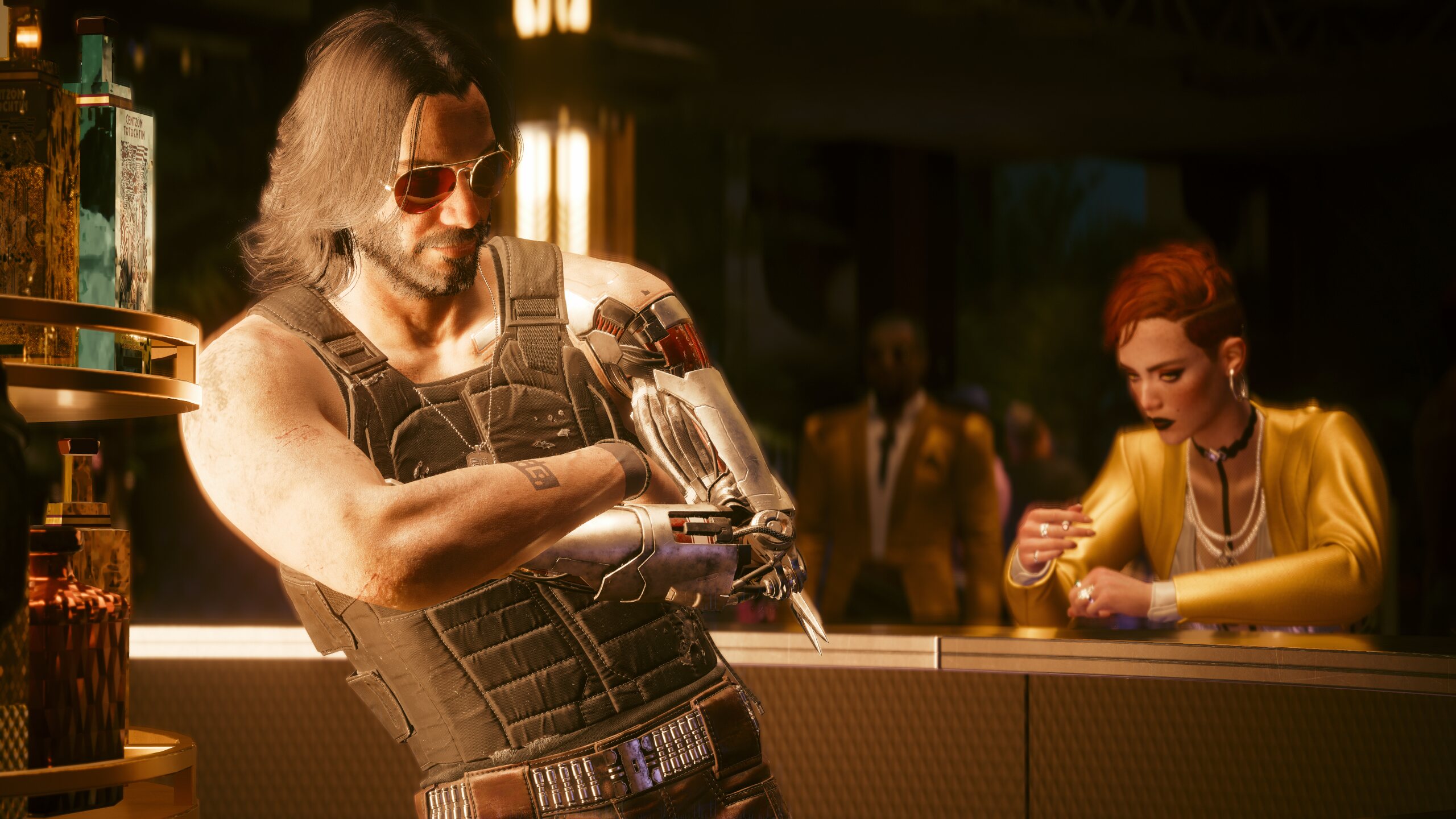 The uninitiated can look at Keanu Reevesโs Johnny Silverhand like Vโs imaginary friend. To put it with a little bit more accuracy, he is a digitized human consciousness downloaded to his cybernetics-implanted brain into Vโs cybernetics-implanted brain who shows up from time to time for conversation throughout the gameโs plot. And once again, I had to deal with the dilemma of choosing which scene to capture thatโs not part of a cutscene. I settled with this one, at a bar in Black Sapphire, the stronghold of the de facto ruler of Dogtown. This is part of a key plot point where V is supposed to gather intel on two people, one of whom is the lady sitting at the bar behind Sllverhand.