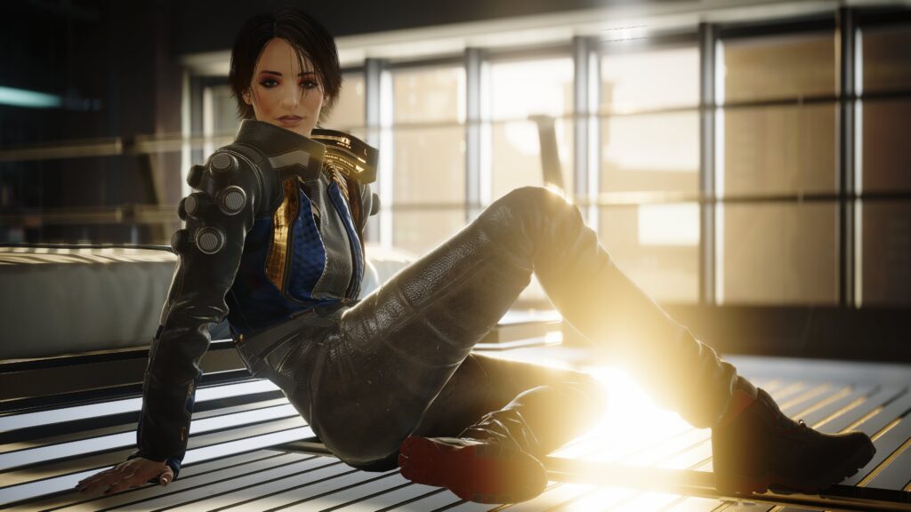 After pondering over it, I settled with a shot of my female V sitting on her bedroom floor while I shot against the light from the windows at the background. This was actually my first idea and among my first shots. I had starting to lean towards a different picture, but eventually came back to this one. I took this shot just before I started installing the mods, so in this photoset, this is the only one using stock appearances. The only mod used here was extra lighting as fill light to compensate for the shadows the intense sunlight coming from behind. Yes, I did try replicating this shot after I installed all those mods. But for some reason, I couldnโt capture the exact vibe as this one. The only explanation I can come up with is that, aside from these sunrises feeling like theyโre not quite the same each passing day, this not-so-feminine pose works well with this tomboyish vanilla version of my female V. The clothing also helped. It was an interesting experience because the same thing happens to me in the real world.