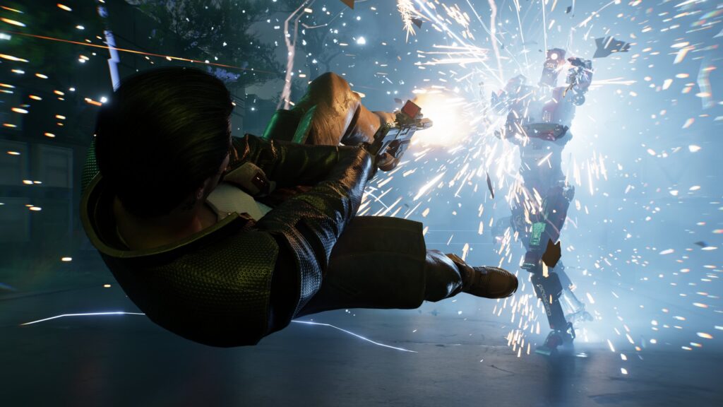 As mentioned earlier, action shots are tricky to take in this game. Vโs body movement while fighting isnโt really rendered in third person point of view. While not really the same, this is compensated for by making use of pre-rendered action poses available in photo mode. Some staging would also be necessary to make the scene up. The Short Circuit quick hack provides some flashy effects when used on a robot. With some luck, I got the timing right for activating photo mode as the sparks flew from the enemy. I didnโt have a pose available for such an action, so I had to improvise. Thereโs a pose with V in the air while shooting, a la Max Payne in Bullet Time. The scene doesnโt quite make sense in the context of an actual combat scene in CP2077. But it makes for a decent action shot. I also had to add just enough lighting aimed at Vโs hair to add some highlights and show some texture. Fortunately, aside from the subtle reflection on Vโs right shoulder, the extra light had no effect on any other part of the frame.